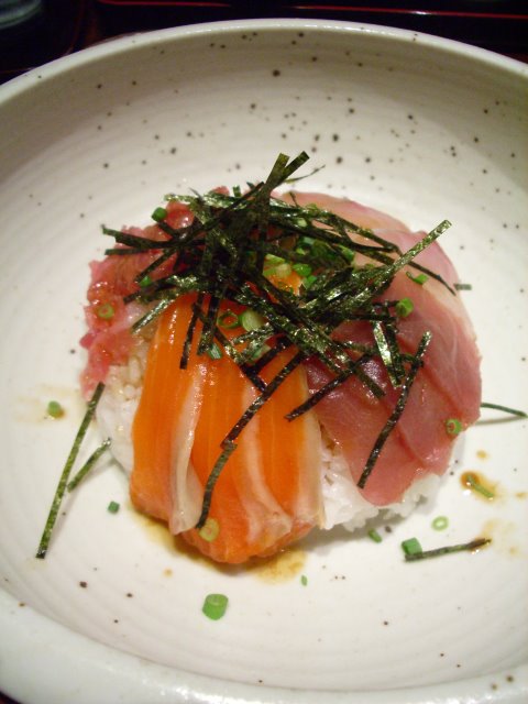 薄作りか?!とおもうぐらい、サーモンにしろ鮪にしろぺらっぺらです。お刺身が薄いせいかごま油ベースのタレがご飯に浸透してしまい油っぽく感じました。うーん。残念。