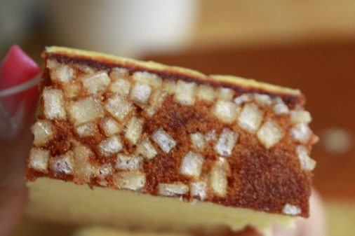うん。おいしい。普通においしい。下のザラメは大きいのはいいけど、やわらかめですぐ溶ける感じでちょっとうるさい感じ。かすてらの甘さは抑え目だけどザラメであまいので残念だな。ザラメなくてもいいかも。