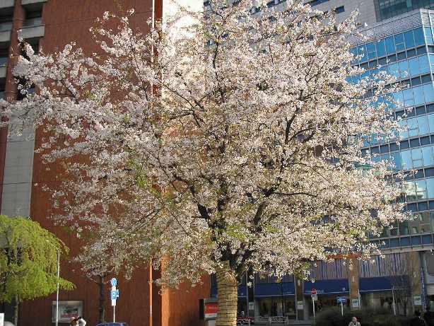 橋の横でビルに囲まれてたくましくそびえ立つ桜の木。