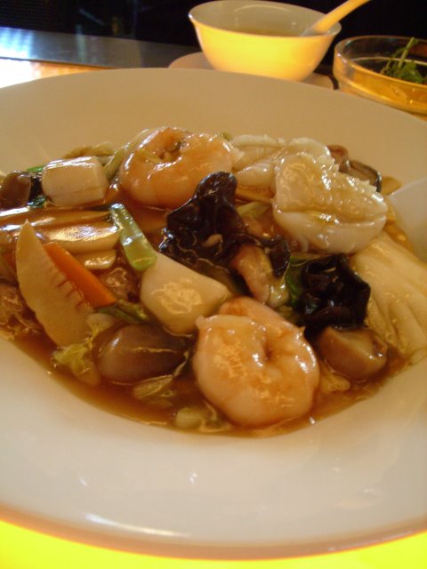 あんかけご飯(1200円)にランチセット(点心、サラダ、デザート)(300円)をつけて注文。