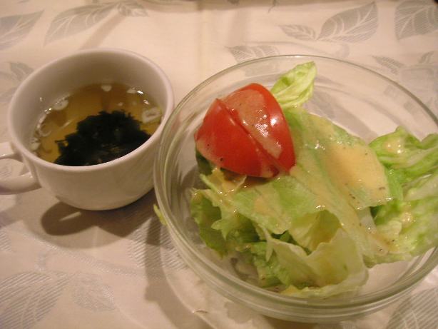 サラダはトマトとレタスにドレッシングかかってます。家庭な感じ。